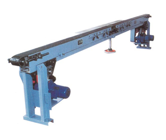 本机用于退火炉前玻璃制品的横向输送,与推瓶机配合将玻璃制品及时、平稳地送至退火炉,该机采用摆线针轮无级减速机和齿链式输送带,其机构先进合理,性能可靠。具有调速范围大、传动平稳、不跑偏、不打滑等特点。